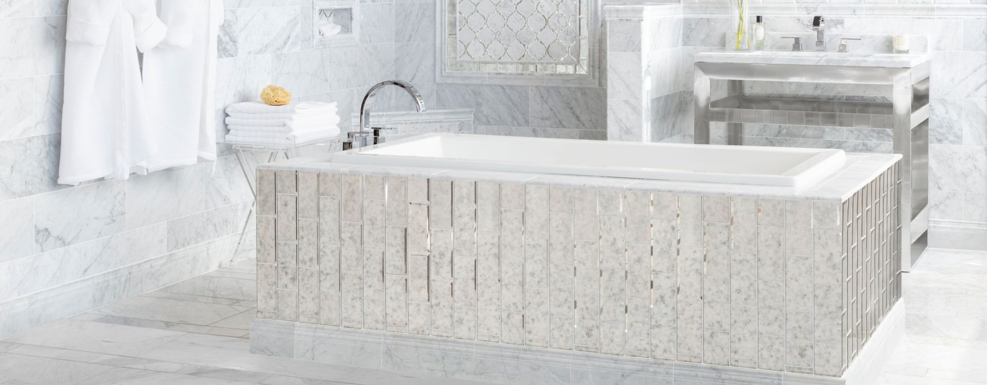 Want to add an exciting accent to your bathroom tile design? Glass mosaics are one of the easiest ways to add pops of color, shine and shape to your shower, recessed shelf or backsplash. You can create a stripe, a framed accent or a full wall with a glass mosaic that has already done the work of pairing colors and materials together for you.